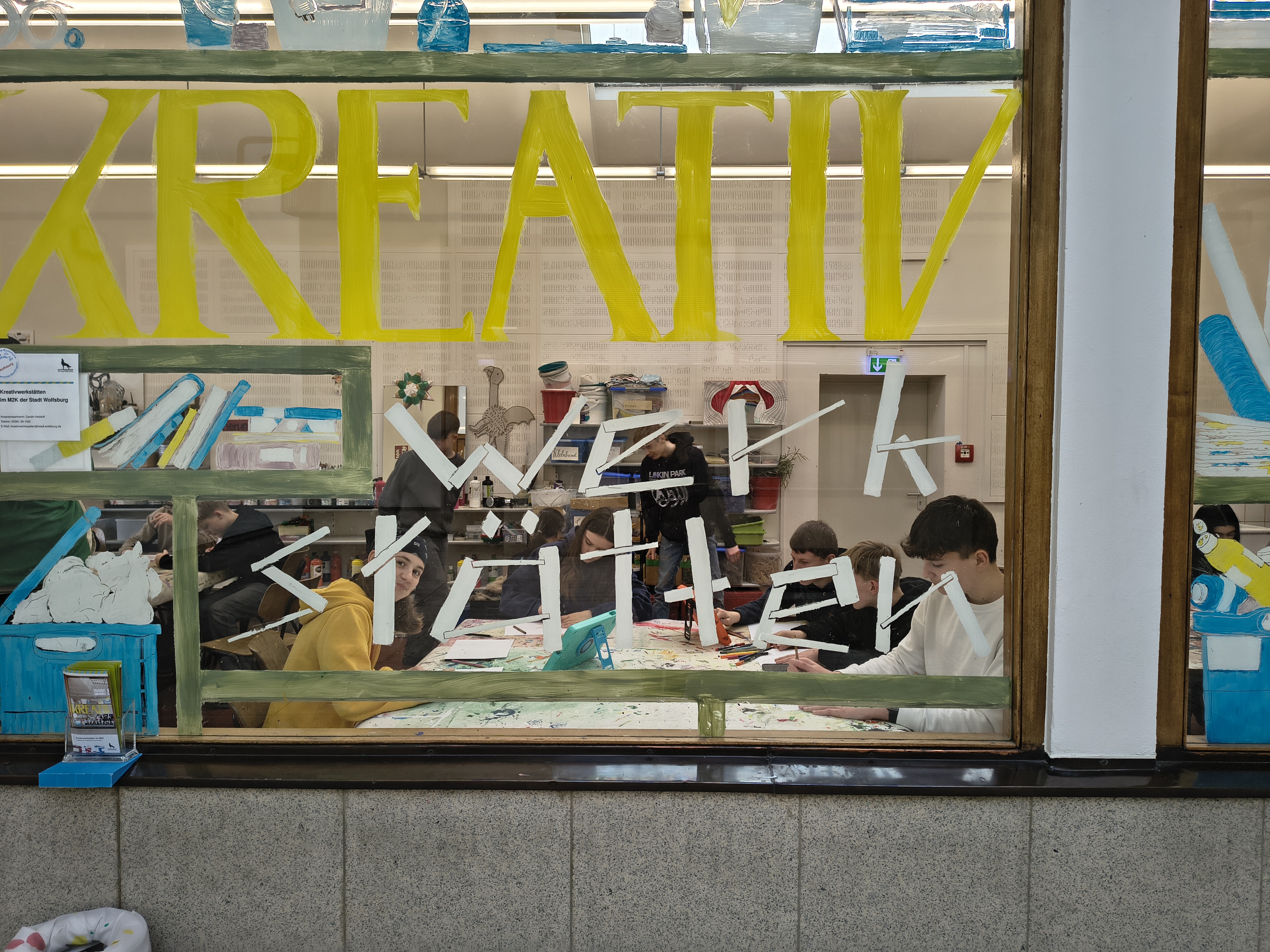 Diese Performance war am 06.02.2026 Teil der Abschlussveranstaltung des Projekts „Cultural Hacking“, das alle sechs Kerngruppen des 8. Jahrgangs an jeweils zwei Tagen in den Kreativwerkstätten im M2K mit der Künstlerin Ilka Theurich bearbeitet haben.
