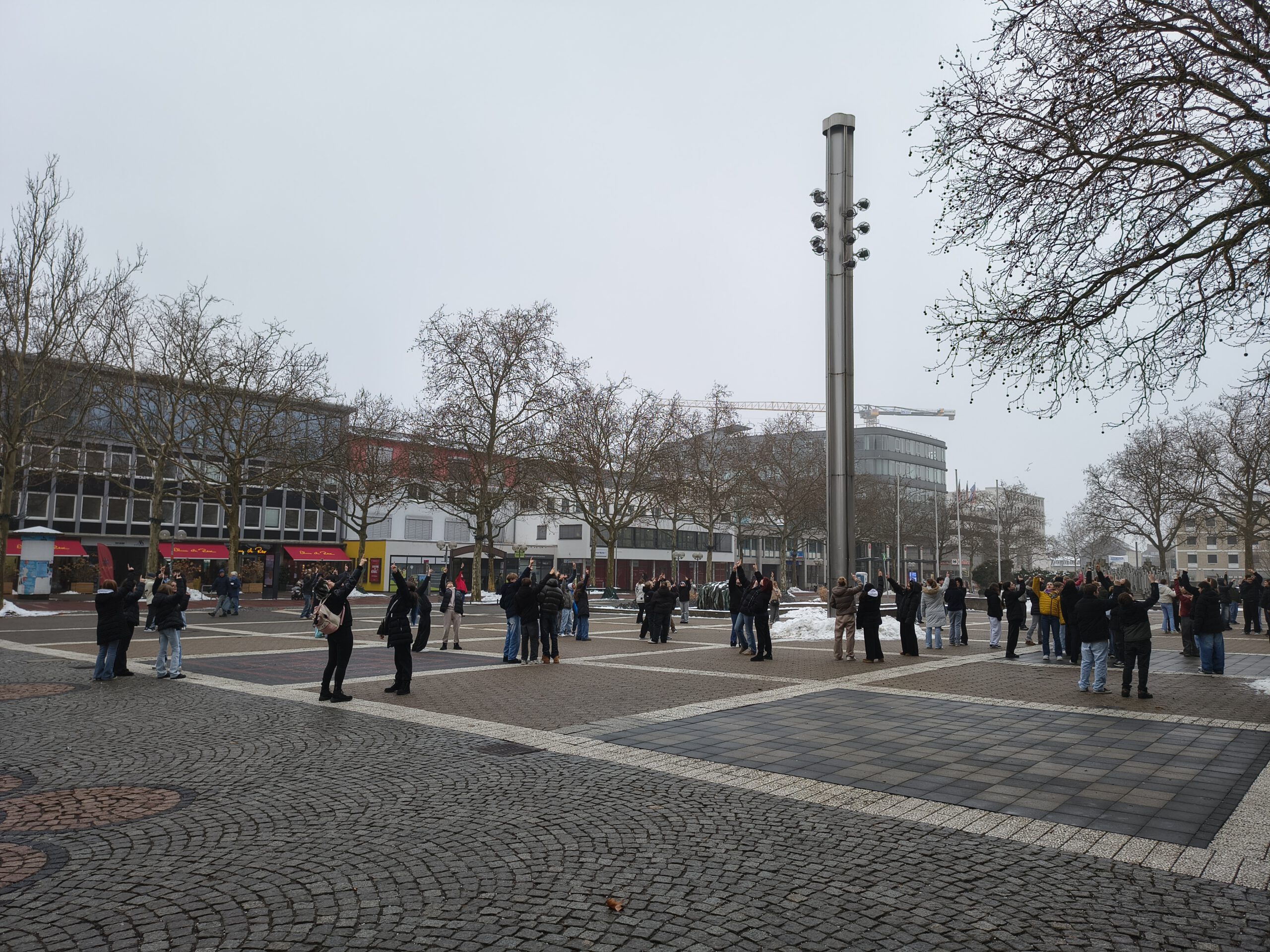 156 Schüler*innen des 8. Jahrgangs, die in den Himmel zeigend für eine Minute auf dem Rathausvorplatz verharren. Dann: ein Signalton. Alles löst sich auf.