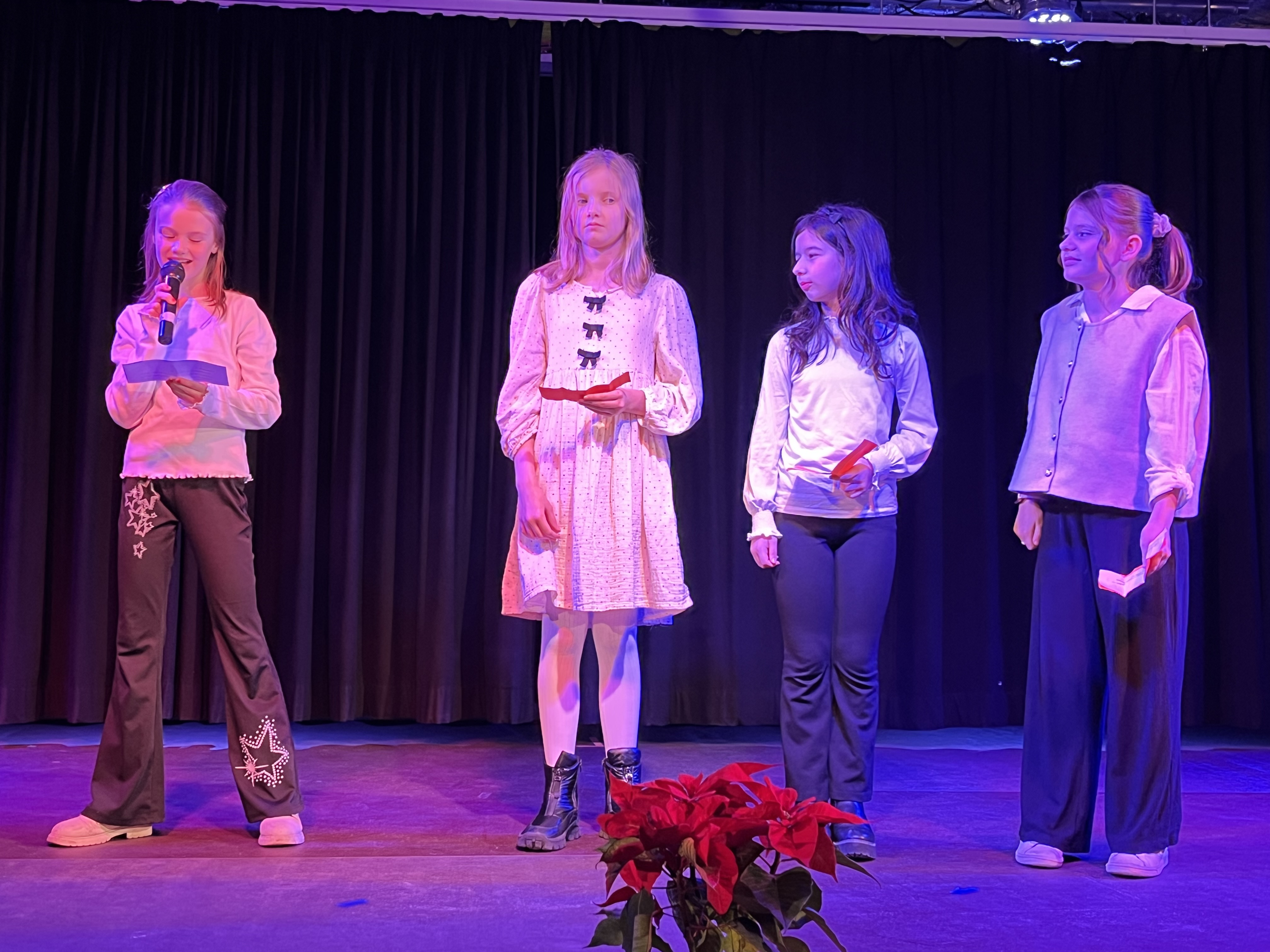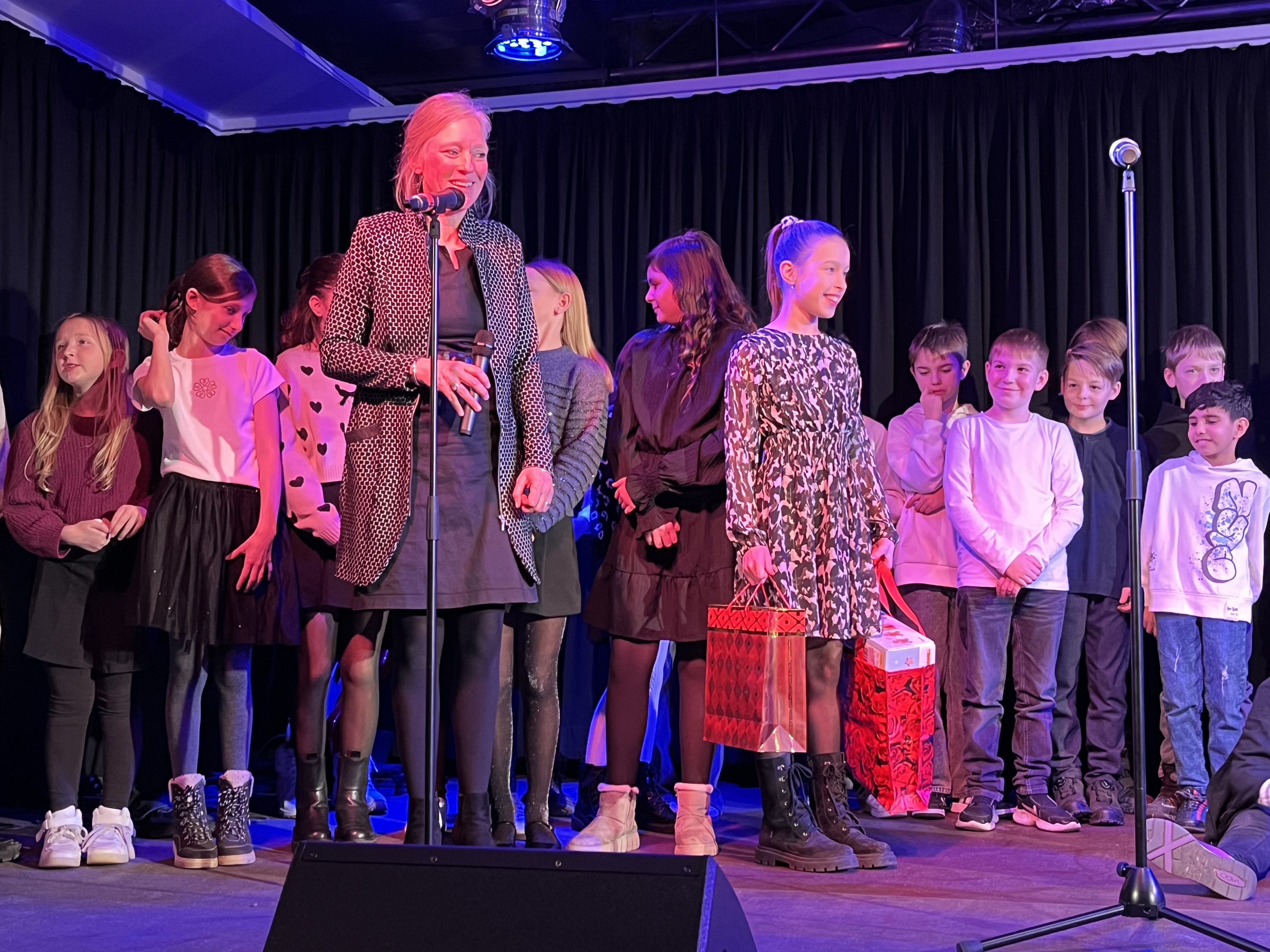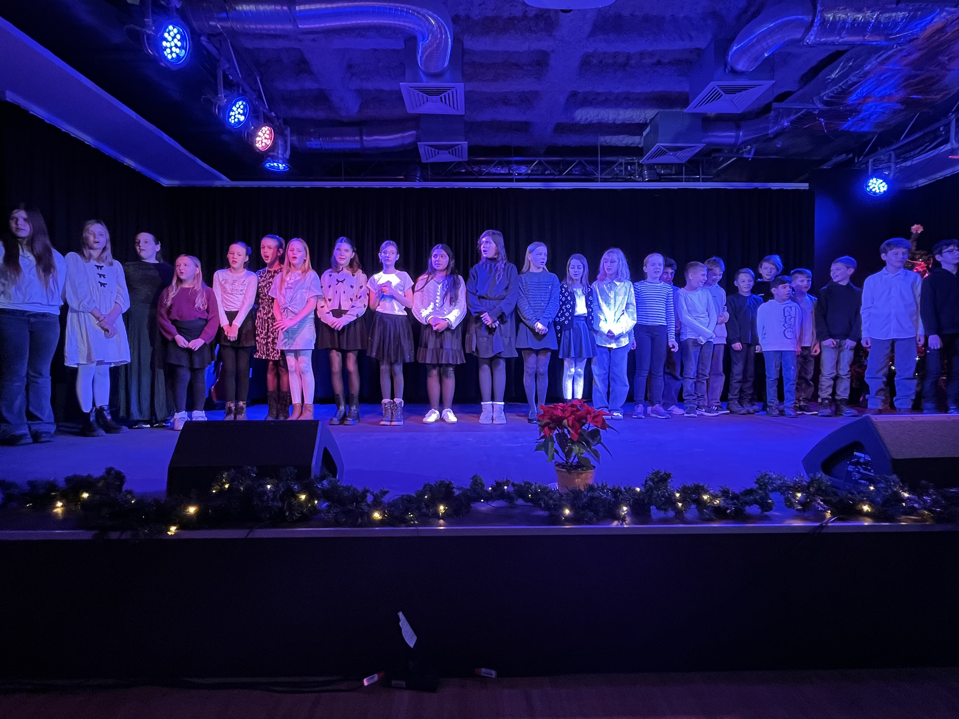 Aber fangen wir am Anfang der Veranstaltung an: ein vollbestuhltes Forum mit vielen Eltern, Großeltern, Geschwistern. Auf der großen Bühnenleinwand ein Lagerfeuer, es erklingt leise Musik, so dass eine vorweihnachtlich- aufgeregte Stimmung zu spüren ist. Dann wird es dunkel. Mit dem Lied „This little light of mine“ ziehen rund160 Schüler*innen singend und ein LED Licht in den Raum bringend ein. Der große Raum füllt sich immer mehr mit Licht und Klang. Nach einer kurzen Begrüßung gibt es einen Opener, der nicht auf dem Programm steht: die „Harmonies“, eine kleine Gesangsformation, die bereits seit 2 Jahren miteinander singt, begrüßt die Teilnehmer*innnen und das Publikum musikalisch. Danach startet die Veranstaltung. Zu hören sind viele bekannte Songs, von „Last Christmas“ bis „Frosty, the snowman“, die mit Begeisterung von den Schüler*innen vorgetragen werden. Hier zeigt sich wieder einmal, wie das gemeinsame Singen verbindet. Auch ein Instrumentalstück ist in diesem Jahr dabei. Mit „Black Pearl“ zeigt eine Kerngruppe auf beeindruckende Art und Weise, wie Musik Geschichten erzählen und wie eine große Gruppe von 30 Personen einen satten Klang erzeugen kann.